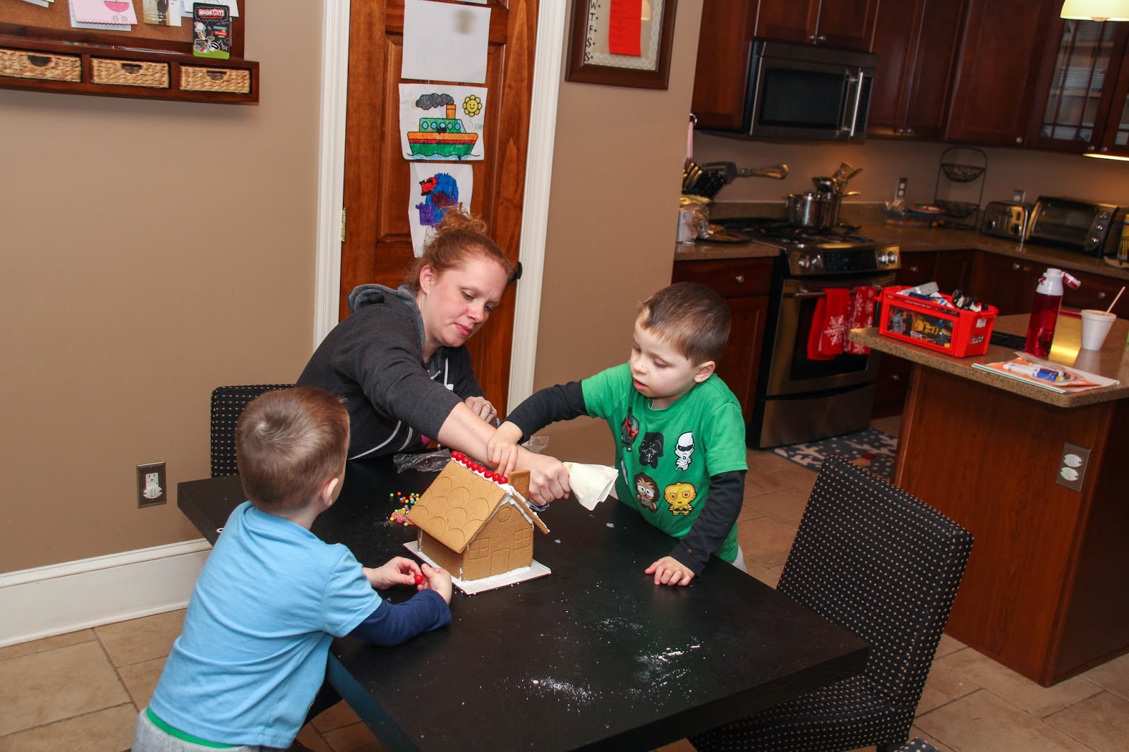 When the boys woke up we gave them some options and of course, they chose to decorate the gingerbread house. I made a simple spaghetti and meatball dinner while the boys worked on constructing the walls. Then I was given the unfortunate task of decorating the house. Man, that icing is pretty complicated material.