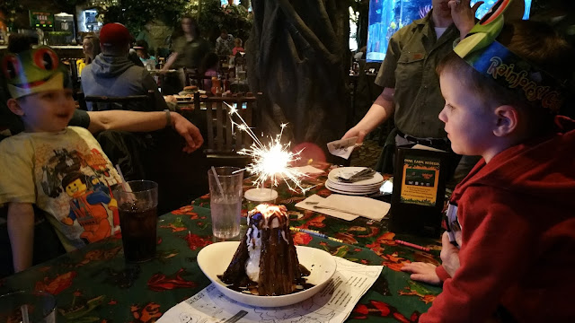 Lunch was delicious, as usual. The Rainforest Cafe always pleases. This year Evan was brave and didn't freak out during the thunderstorms! They wore their hats, they loved their Sparkling Volcano (well worth the $15 dessert we could all share), and everyone left with a smile on the face.