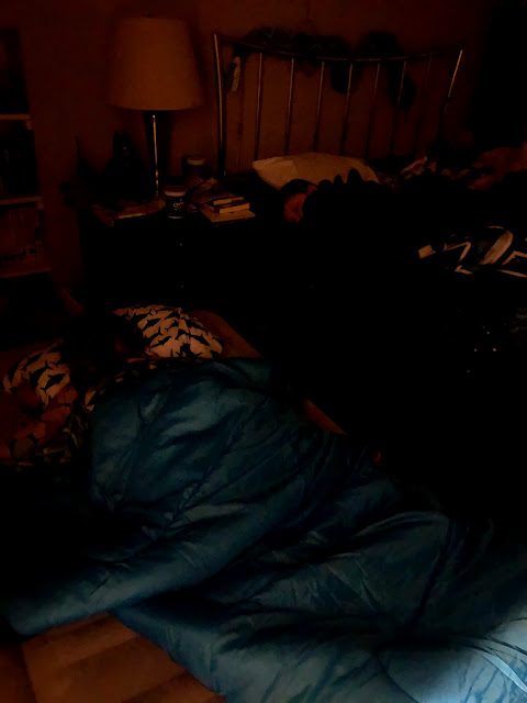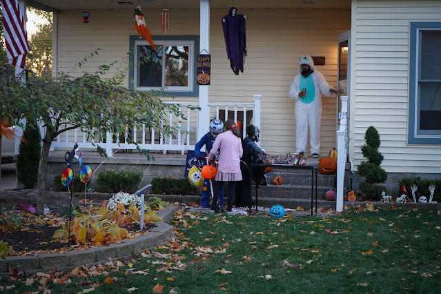 After dinner we got ready to head out for trick-or-treating. We all masked up and were pleasantly surprised to see so many creative ways people found to pass out candy. From PVC pipes that were used as "candy shoots" to tables set up in people's driveways while they waved from their front porch or garage, we appreciated that most tried to make the day as special as it could be for the kids. The restoration store at the end of our street had their big bonfire going and even was offering hayrides on a tractor. We didn't partake, but it looked fun. The kids got back around 8, went through their bags of candy and made some trades. The adults started a game of euchre.