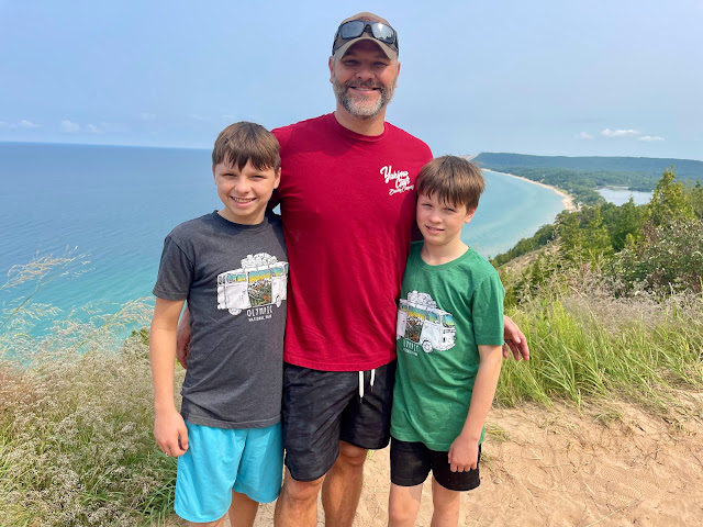 Tuesday morning we got up, after a great night of sleep, and made eggs and bacon for breakfast. We packed lunches and got ready to venture out to some spots along M-22 for the day. Our first stop was the Empire Bluff Trail that was absolutely gorgeous! The hike was easy and the views were well worth it. Next up was the hike to Pyramid Point. That uphill hike was a little more challenging, but again, the view was incredible! The kids wanted to run down the dune, but we made them stay put as we weren't up for a 3 hour climb back up. We ate our lunch in the car and drove on to Leland to do some shopping and swim at Van's Beach. The kids found petoskey stones, they enjoyed swimming, and we got Moomers ice cream and a book about Michigan birds from a small book shop.