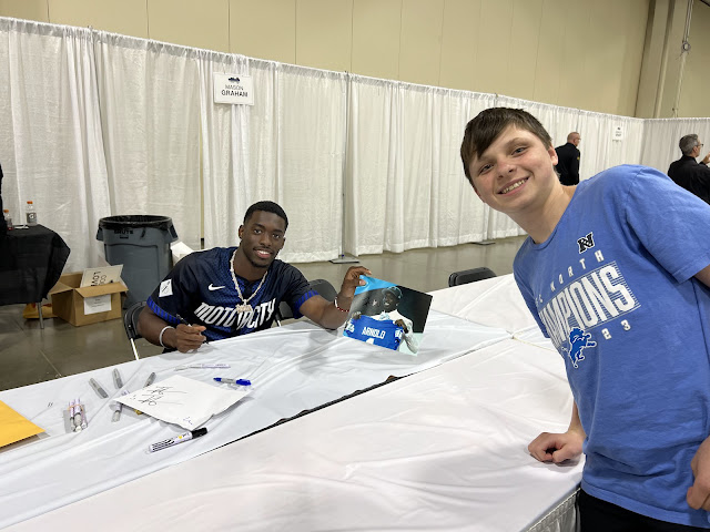 Sean went with Grandpa during one of Evan's baseball tournaments on a Saturday in June to the Novi Showplace to the Detroit Sports Spectacular. He had goals of meeting some Tigers and Lions players to get their autographs and to get some good baseball/football trading cards. Grandpa picked him up early and they went at opening. All of the Tigers players canceled so he decided to pay for meeting Brian Branch, Terrion Arnold, and Kerby Joseph.